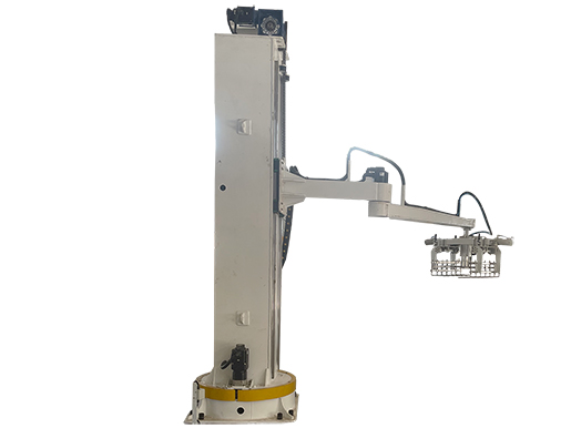 立柱機(jī)器人碼垛機(jī)的運(yùn)作流程是將包裝好的物料通過輸送機(jī)送至碼垛制定區(qū)定位,立柱機(jī)器人通過各軸配合,將夾具運(yùn)行至物料定位的正上方,當(dāng)物料定位信號(hào)發(fā)出時(shí),夾具通過伺服電機(jī)控制運(yùn)動(dòng)向 下即Z軸向下運(yùn)動(dòng),達(dá)到夾具夾持物料高度時(shí),Z軸停止下降,夾具開啟,夾起物料,Z軸伺服電機(jī)反轉(zhuǎn),將夾具升到安全高度后,通過客戶預(yù)設(shè)程序?qū)⑽锪纤椭链a垛位上方,Z軸下降,使物料到達(dá)放置 點(diǎn),此時(shí)夾具打開,將物料碼入制定位置,重復(fù)以上動(dòng)作,把整個(gè)托盤碼垛完以后,報(bào)警提示,提醒已經(jīng)碼垛完成。人工叉車將碼垛好的托盤運(yùn)走,放入新的托盤,重新往復(fù)動(dòng)作來完成批量生產(chǎn)碼垛 入庫(kù)。