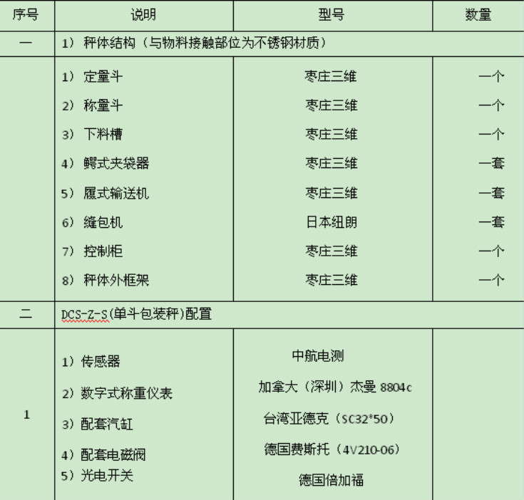 一。DCS- Z-S定量包裝秤(單斗包裝秤)設(shè)備配置詳單: